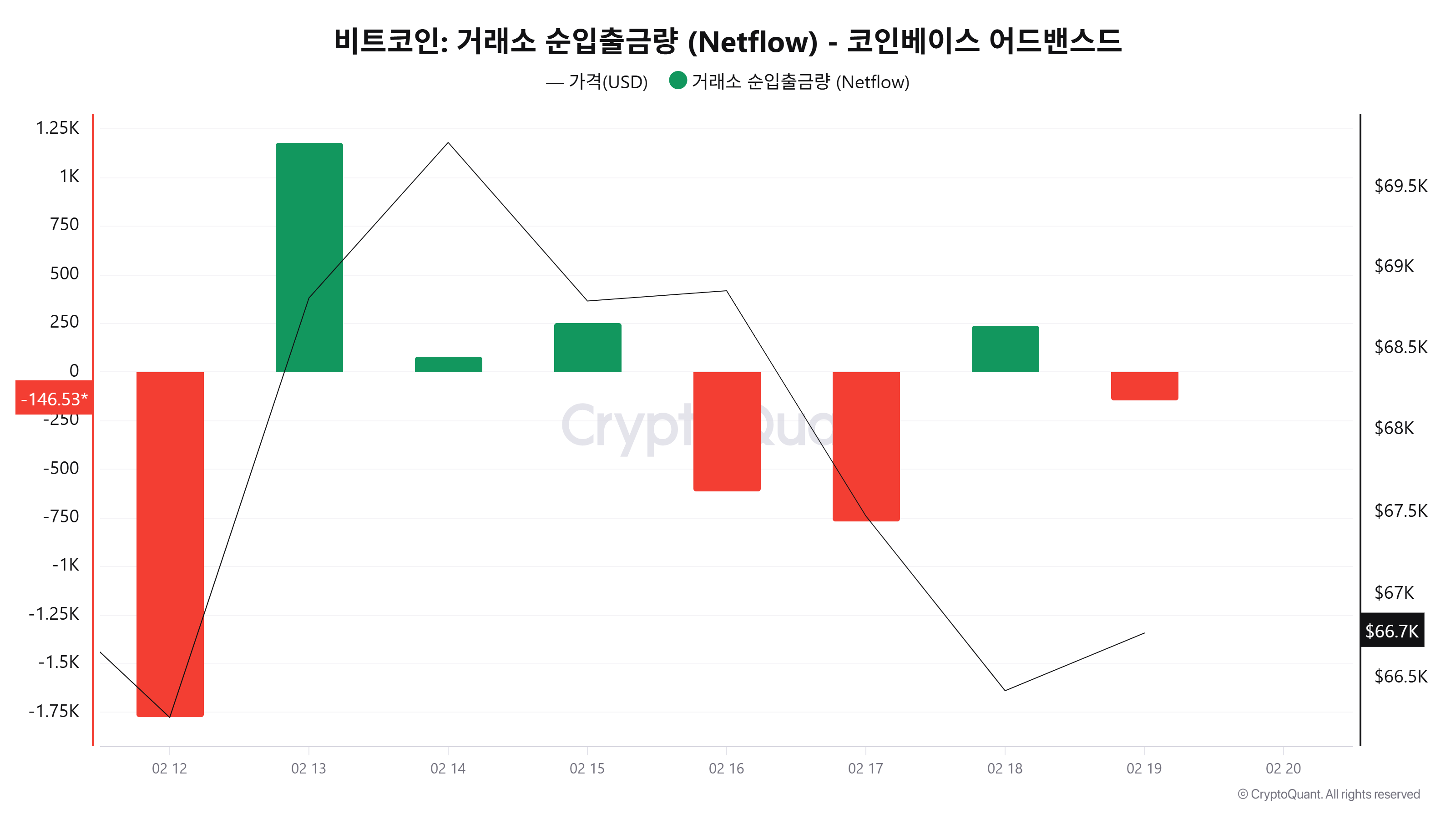 크립토퀀트 데이터에 따르면 2월 19일(UTC 기준, 미완결) 코인베이스 비트코인 순입출금은 –146BTC로 집계됐다. 전일(+238BTC) 순입금에서 다시 순유출로 전환되며 자금 흐름이 재차 약화된 모습이다.