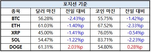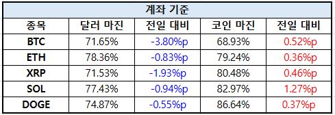 이더리움(ETH)은 달러 마진 61.03%로 1.40%p 하락했으며, 코인 마진은 67.52%로 2.33%p 감소했다. XRP는 달러 마진 45.00%로 1.41%p 낮아졌고, 코인 마진은 76.05%로 0.54%p 하락했다.
