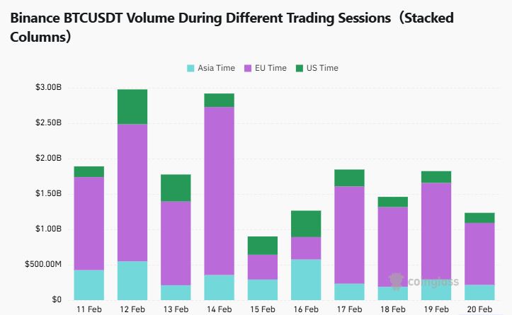 바이낸스 BTCUSDT 거래량은 19일 기준 아시아 시간대 2억1471만 달러, 유럽 시간대 8억7592만 달러, 미국 시간대 1억4278만 달러로 집계됐다.