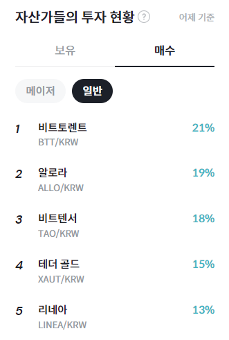 자산가들의 투자 현황에 따르면 어제 기준 빗썸 내 자산 규모 상위 투자자들은 비트토렌트(BTT)를 21%로 가장 높은 비중으로 매수한 것으로 나타났다. 이어 알로라(ALLO)가 19%, 비트텐서(TAO)가 18%를 기록했으며, 테더 골드(XAUT)는 15%, 리니아(LINEA)는 13%로 집계됐다. 해당 지표는 빗썸에서 자산 규모 상위 투자자들의 순매수 금액 비중을 기준으로 산출된 것으로, 메이저 외 일반 종목 및 대체 자산 중심의 자금 분산 흐름이 이어지고 있음을 보여준다.