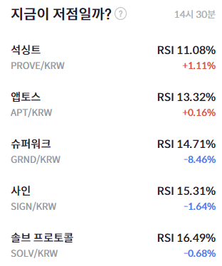 기술적 지표 측면에서는 과매도 신호가 일부 종목에서 감지됐다. 14시 30분 기준 석싱트(PROVE)는 RSI 11.08%를 기록했고, 앱토스(APT)는 13.32%, 슈퍼워크(GRND)는 14.71%, 사인(SIGN)은 15.31%, 솔브 프로토콜(SOLV)은 16.49%로 집계됐다. 모두 RSI 30 이하의 과매도 구간에 위치해 단기 반등 가능성이 거론되는 상황이다.