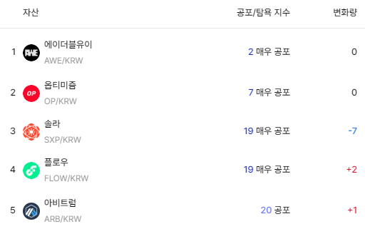 공포·탐욕 지표에서도 솔라는 하위권에 위치했다. 에이더블유이(AWE·2), 옵티미즘(OP·7), 솔라(SXP·19), 플로우(FLOW·19), 아비트럼(ARB·20) 등이 ‘공포’ 또는 ‘매우 공포’ 구간에 머물렀다. 일부 종목은 단기 반등 흐름을 보이고 있으나, 전반적인 투자 심리는 여전히 위축된 모습이다.