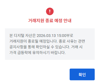특히 업비트는 공지를 통해 솔라(SXP)의 거래지원이 2026년 3월 13일 15시부로 종료될 예정이라고 안내했다. 거래지원 종료 사유는 별도 공지사항을 통해 확인할 수 있으며, 거래 종료 전 가격 급등락 가능성에 유의할 필요가 있다고 덧붙였다.