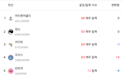 공포·탐욕 지표에서도 어드벤처골드는 최상위권을 기록했다. AGLD는 99포인트로 집계됐으며, 엔소(ENSO·93), 카이트(KITE·84), 오브스(ORBS·83), 만트라(OM·72) 등이 뒤를 이었다. 일부 NFT·게임 및 문화·엔터테인먼트 관련 종목을 중심으로 단기 과열 신호가 포착되고 있다.