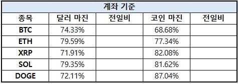 솔라나(SOL)는 달러 마진 79.35%, 코인 마진 81.62%를 보였으며, 도지코인(DOGE)은 달러 마진 72.11%, 코인 마진 87.04%로 나타났다.