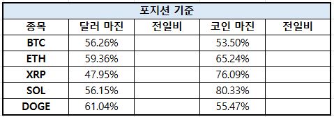 솔라나(SOL)는 달러 마진 56.15%, 코인 마진 80.33%로 집계됐으며, 도지코인(DOGE)은 달러 마진 61.04%, 코인 마진 55.47%를 기록했다.