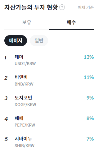 자산가들의 투자 현황에 따르면 어제 기준 업비트 내 자산 규모 상위 투자자들은 테더(USDT)를 13%로 가장 높은 비중으로 매수 포트폴리오에 반영한 것으로 나타났다. 비앤비(BNB)가 11%로 뒤를 이었으며, 도지코인(DOGE)은 9%를 기록했다. 이어 페페(PEPE)가 8%, 시바이누(SHIB)가 7%로 집계됐다. 해당 지표는 업비트에서 자산 규모 상위 투자자들의 순매수 금액 비중을 기준으로 산출된 것으로, 고액 투자자들의 선호 흐름을 보여준다.