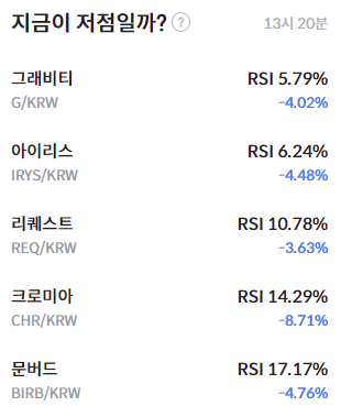 기술적 지표 측면에서는 과매도 신호가 일부 알트코인에서 두드러졌다. 오후 1시 20분 기준 그라비티(G)는 RSI 5.79%, 아이리스(IRYS)는 6.24%를 기록하며 한 자릿수 과매도 구간에 진입했다. 이어 리퀘스트(REQ)는 10.78%, 크로미아(CHR)는 14.29%, 문버드(BIRB)는 17.17%로 모두 RSI 30 이하의 과매도 구간에 머물렀다.