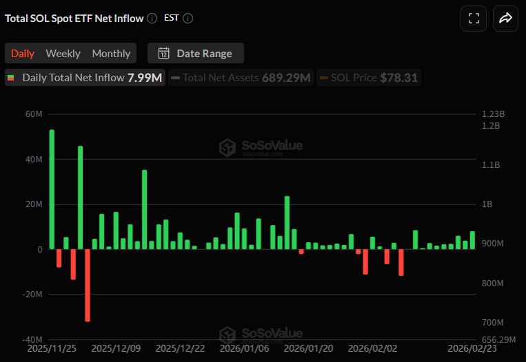 솔라나(SOL) 현물 ETF 시장은 799만 달러의 일간 순유입을 기록했다. 최근 9거래일 연속 순유입 흐름이 이어지며 자금 유입세가 확대되는 모습이다.