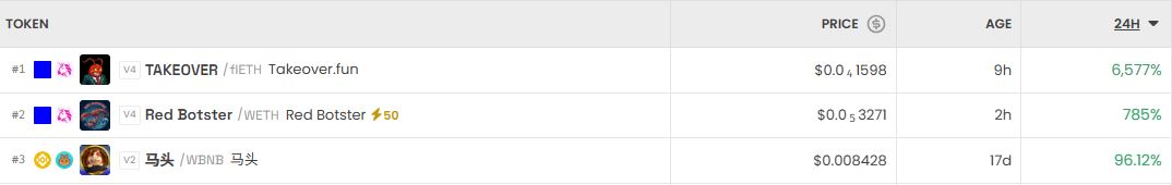 가장 크게 오른 거래쌍은 TAKEOVER(FIETH)로 24시간 기준 6,577% 상승했다. 이어 Red Botster(WETH)는 785% 올랐고, 믹스(WBNB)는 96.12% 상승했다.
