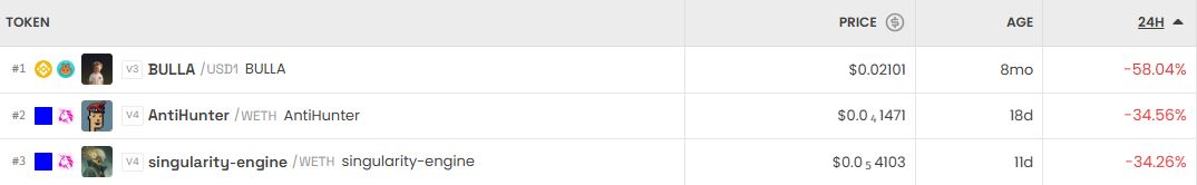 반면 가장 크게 하락한 거래쌍은 BULLA(USD1)로 24시간 기준 -58.04%를 기록했다. AntiHunter(WETH)는 -34.56%, singularity-engine(WETH)는 -34.26%로 약세 흐름을 보였다.