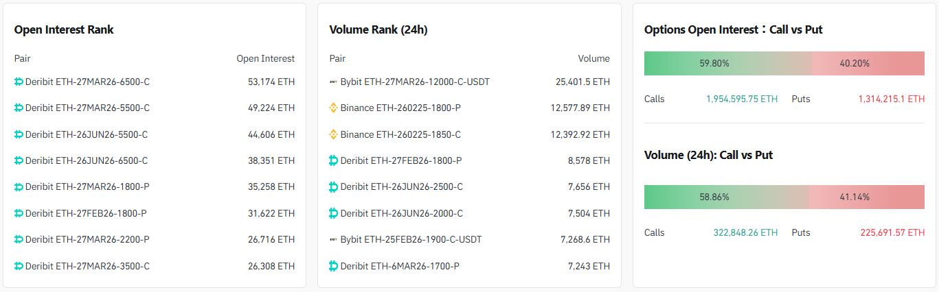 24시간 거래량 기준 상위 계약은 ▲1만2000달러 콜옵션(3월 27일·바이비트) ▲1800달러 풋옵션(2월 26일·바이낸스) ▲1850달러 콜옵션(2월 26일·바이낸스) 순으로 나타났다.
