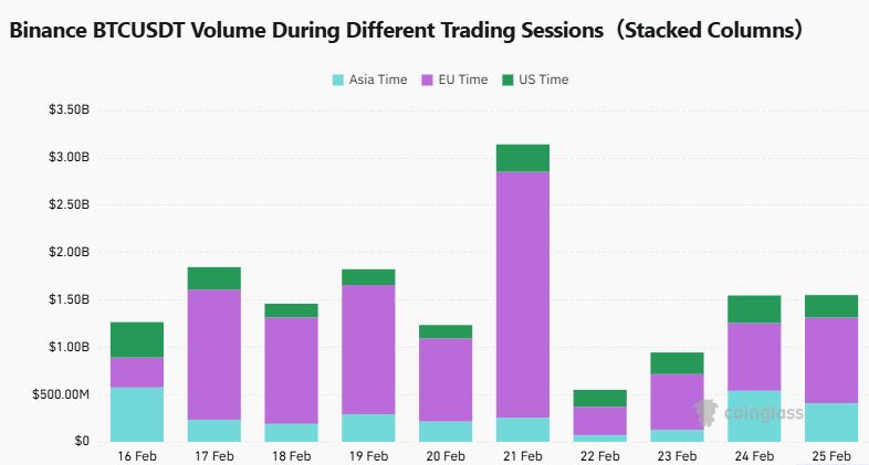 바이낸스 BTCUSDT 거래량은 24일 기준 아시아 시간대 4억734만 달러, 유럽 시간대 9억540만 달러, 미국 시간대 2억3726만 달러로 집계됐다.