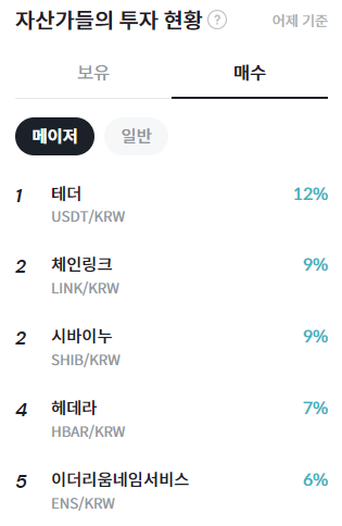 자산가들의 투자 현황에 따르면 어제 기준 업비트 내 자산 규모 상위 투자자들은 테더(USDT)를 12%로 가장 높은 비중으로 매수 포트폴리오에 반영한 것으로 나타났다. 체인링크(LINK)와 시바이누(SHIB)는 각각 9%로 공동 2위를 기록했으며, 헤데라(HBAR)는 7%, 이더리움네임서비스(ENS)는 6%로 집계됐다. 해당 지표는 업비트에서 자산 규모 상위 투자자들의 순매수 금액 비중을 기준으로 산출된 것으로, 자산가들의 선호 흐름을 보여준다.