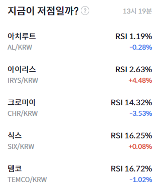 기술적 지표 측면에서는 일부 종목에서 극단적인 과매도 신호가 포착됐다. 오후 1시 19분 기준 아치루트(AL)는 RSI 1.19%를 기록하며 한 자릿수 초반까지 하락했다. 아이리스(IRYS)는 2.63%, 크로미아(CHR)는 14.32%, 식스(SIX)는 16.25%, 템코(TEMCO)는 16.72%로 모두 RSI 30 이하의 과매도 구간에 머물렀다.