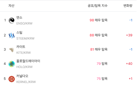 공포·탐욕지수 상위 종목을 보면 엔소(ENSO)가 98로 ‘매우 탐욕’ 단계에 위치했고, 스팀(STEEM)은 88, 카이트(KITE)는 81을 기록했다. 홀로월드에이아이(HOLO)는 79로 탐욕 구간에 자리했다. 특히 최근 지수 상승폭이 크게 확대되며 투자 심리 개선 속도가 빠른 종목으로 분류되고 있다.