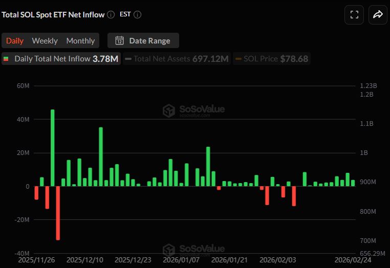 솔라나(SOL) 현물 ETF 시장은 378만 달러의 일간 순유입을 기록했다. 지난 10거래일 동안 유입세를 이어가고 있다. 다만 전일(799만 달러) 대비 유입 규모는 다소 축소됐다.