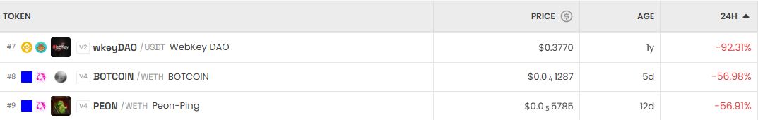 반면 가장 크게 하락한 거래쌍은 wkeyDAO(USDT)로 24시간 기준 -92.31%를 기록했다. BOTCOIN(WETH)은 -56.98%, PEON(WETH)은 -56.91%로 약세 흐름을 보였다.