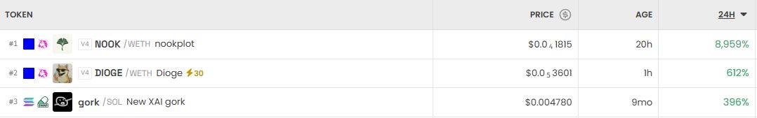 가장 크게 오른 거래쌍은 NOOK(WETH)로 24시간 기준 8,959% 상승했다. 이어 DIOGE(WETH)는 612% 올랐고, gork(SOL)는 396% 상승했다.