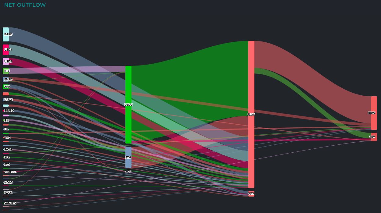 테더(USDT)에서 움직인 자금은 2억3500만 달러로, 이 중 1억3500만 달러가 비트코인(BTC), 2900만 달러가 솔라나(SOL), 1800만 달러가 BNB로 향했다.