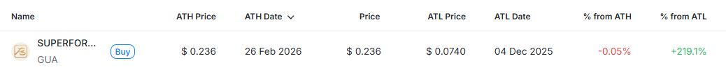 26일 현재까지 1개 종목이 신고점을 경신했다. 슈퍼포지션(GUA)은 0.236달러에 거래되며 사상 최고가와 사실상 동일한 수준을 유지하고 있다. 지난해 12월 4일 기록한 저점 0.0740달러 대비 219% 이상 상승한 상태로, 단기간 급등 이후 고점 부근에서 가격 안착 여부를 시험하는 구간에 진입했다. 현재 가격은 ATH 대비 -0.05%로 소폭 밀린 수준에 불과해, 매물 소화 이후 추가 신고가 경신 가능성도 열려 있는 흐름이다.