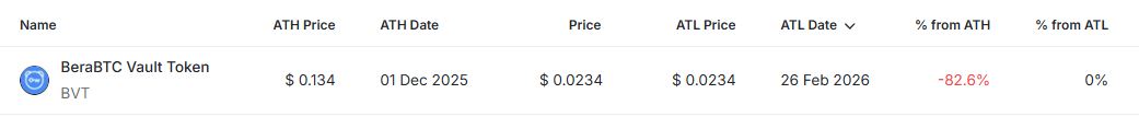전체 1개 종목이 신저점을 경신한 것으로 집계됐다. 베라BTC볼트토큰(BVT)은 26일 기준 0.0234달러에 거래되며 사상 최저가를 새로 기록했다. 지난해 12월 1일 기록한 최고가 0.134달러 대비 80% 넘게 하락한 이후 저점 영역에서 반등 없이 약세 흐름이 이어지는 모습이다. 현재 가격은 ATL과 동일한 수준으로, 단기적인 기술적 반등 여부가 관건으로 평가된다.