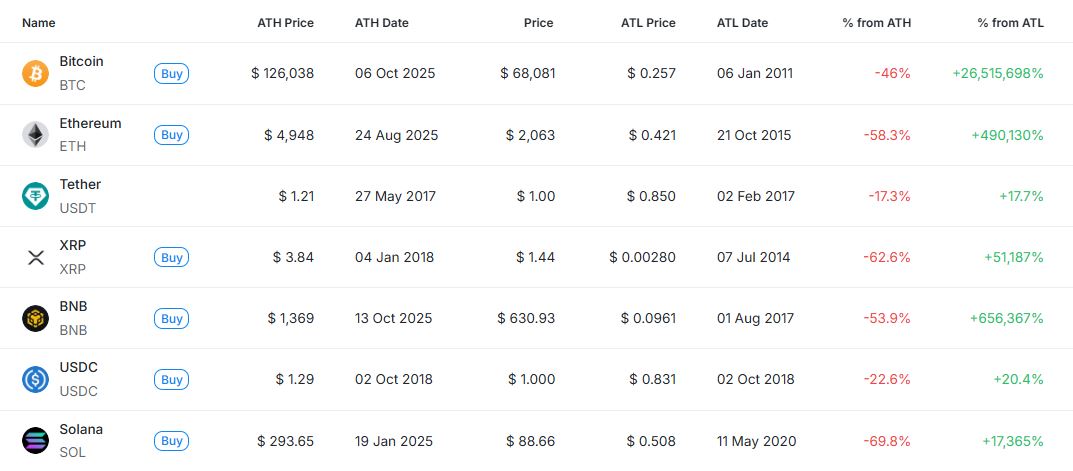 [편집자주] 암호화폐 시장은 하루 새 고점과 저점이 빠르게 바뀌는 고변동성 환경이다. 역대 최고가(ATH)와 역대 최저가(ATL) 경신 종목을 추적하면 강세와 약세 흐름을 조기에 포착할 수 있다. 크립토랭크 기준 시가총액 1000만 달러 이상 종목 중 하루 사이 고점 또는 저점을 경신한 주요 토큰을 정리하고 시가총액 상위 종목과 실시간 국내 인기 자산의 고점 대비 조정률을 함께 분석해 시장 회복 여력과 흐름을 진단한다.