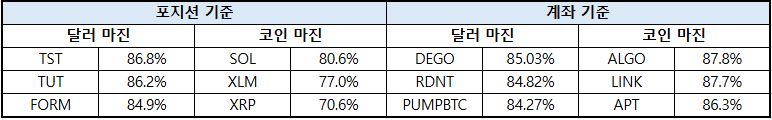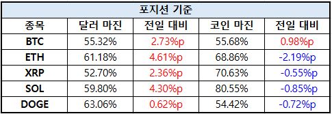 이더리움(ETH)은 달러 마진 61.18%로 4.61%p 급증했으나, 코인 마진은 68.86%로 2.19%p 하락했다. XRP는 달러 마진 52.70%로 2.36%p 상승한 반면, 코인 마진은 70.63%로 0.55%p 낮아졌다.