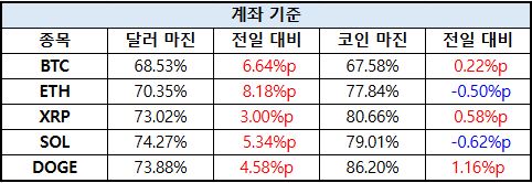 이더리움(ETH)은 달러 마진 70.35%로 8.18%p 급증했으나, 코인 마진 77.84%는 0.50%p 감소했다. XRP는 달러 마진 73.02%로 3.00%p 상승했고, 코인 마진도 80.66%로 0.58%p 확대됐다.