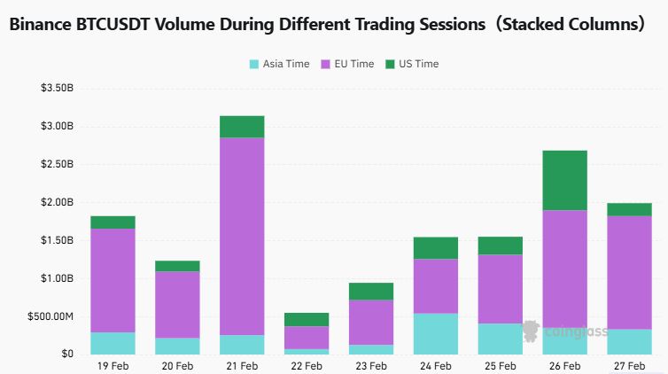 바이낸스 BTCUSDT 거래량은 26일 기준 아시아 시간대 3억3038만 달러, 유럽 시간대 14억9000만 달러, 미국 시간대 1억7011만 달러로 집계됐다.