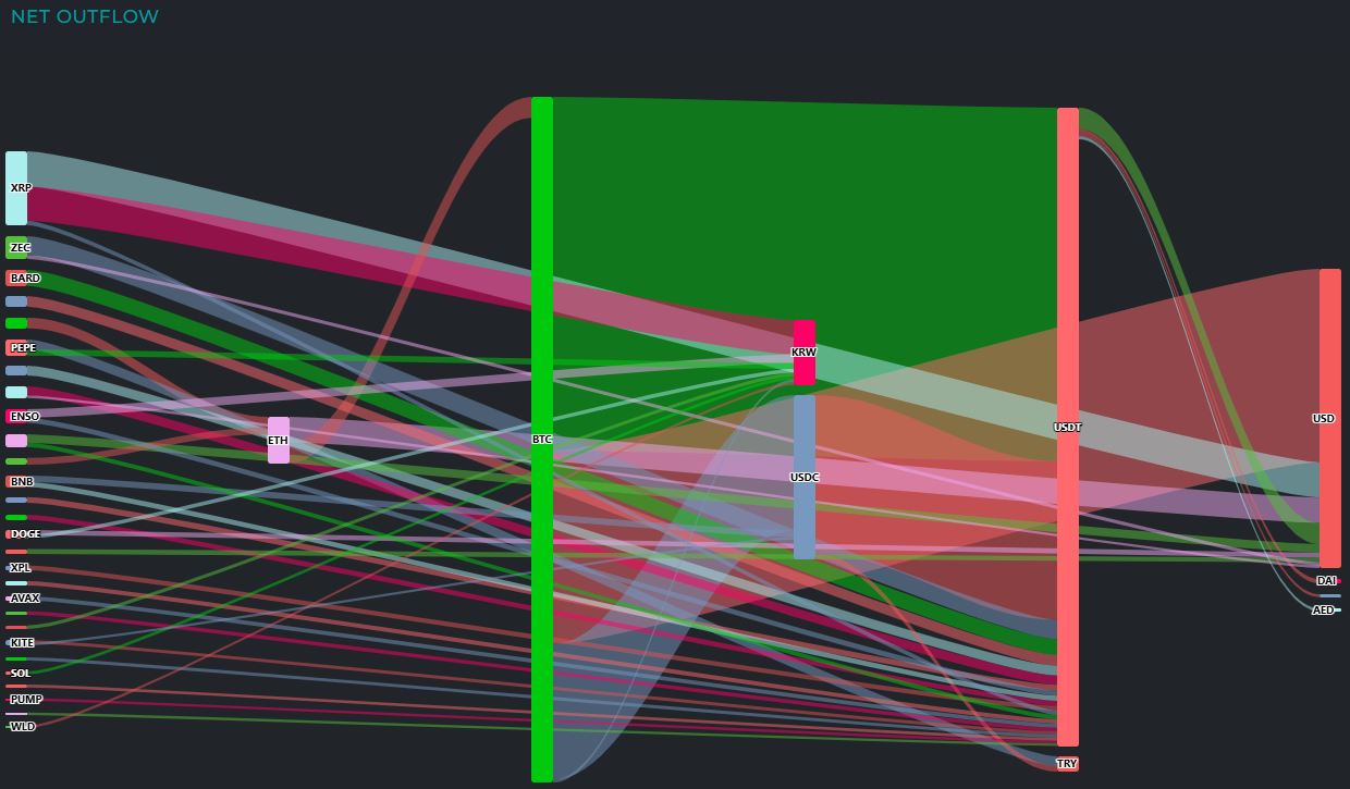 XRP는 2000만 달러가 유출됐고, 이 중 1000만 달러는 원화(KRW), 970만 달러는 달러(USD)로 향했다. 이더리움(ETH)도 1300만 달러가 유출되며 매도 압력이 확인됐다. ZEC에서는 700만 달러, BARD와 PEPE는 각각 500만 달러 규모의 이탈이 나타났다.