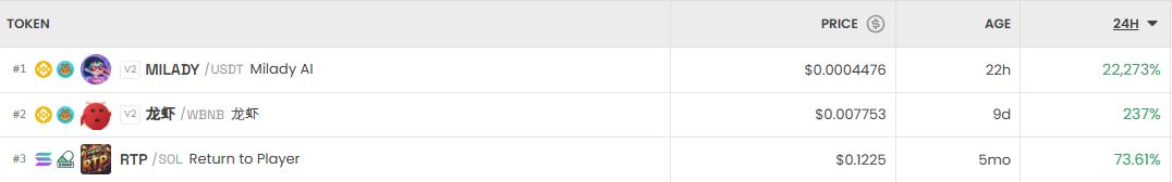 가장 크게 오른 거래쌍은 MILADY(USDT)로 24시간 기준 22,273% 상승했다. 이어 龙虾(WBNB)는 237% 올랐고, RTP(SOL)는 73.61% 상승했다.