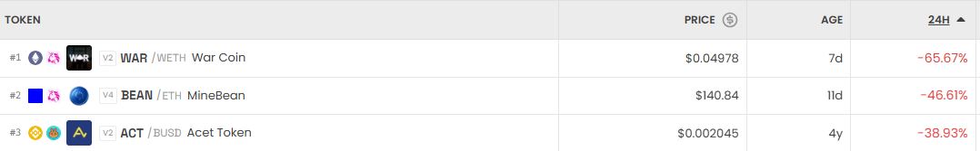 반면 가장 크게 하락한 거래쌍은 WAR(WETH)로 24시간 기준 -65.67%를 기록했다. BEAN(ETH)은 -46.61%, ACT(BUSD)는 -38.93%로 약세 흐름을 보였다.