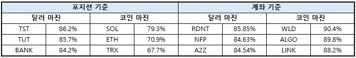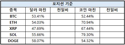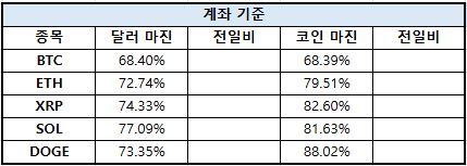 이더리움(ETH)은 달러 마진 72.74%, 코인 마진 79.51%로 집계됐다. XRP는 달러 마진 74.33%, 코인 마진 82.60%로 나타났다.