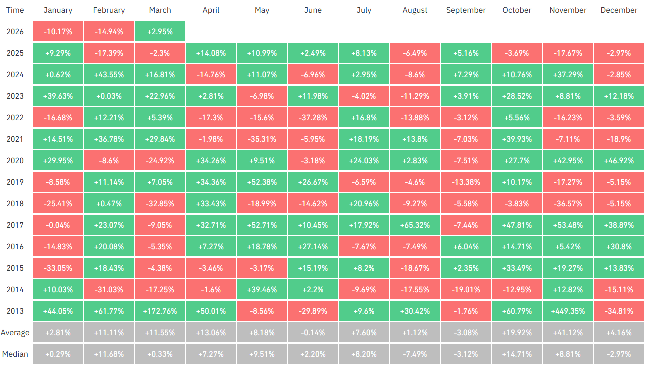 이달 현재까지 비트코인은 2.95%의 월간 수익률을 기록 중이다. 3월 평균 수익률 11.55%를 하회하고 있지만 중앙값은 0.33%를 웃돌고 있다. 3월은 13번 중 7번 하락 마감했다.