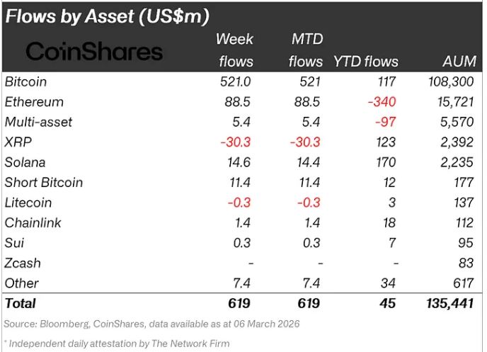 9일(현지시간) 코인셰어스에 따르면 지난주 디지털자산 투자상품에는 총 6억1900만 달러가 유입됐다. 이란 관련 지정학적 긴장이 시장에 영향을 미친 가운데서도 자산군에 대한 초기 반응은 대체로 긍정적인 흐름을 보였다.