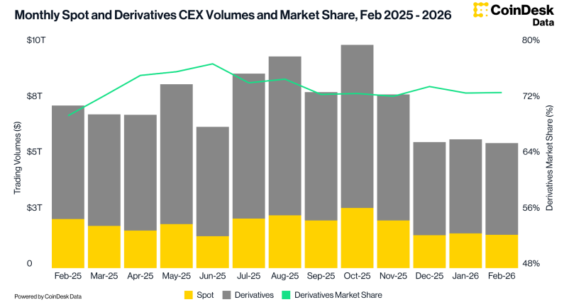 시장 구조 측면에서는 파생상품 비중이 소폭 확대됐다. 2월 전체 암호화폐 거래에서 파생상품이 차지하는 비중은 73.2%로 1월의 73.1%보다 소폭 상승했다.