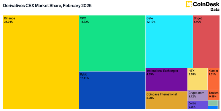 전체 파생상품 거래 점유율에서도 바이낸스의 우위는 유지됐다. 바이낸스는 35.0%의 시장 점유율로 1위를 기록했다. 이어 OKX가 18.3%, 바이비트가 12.4%, Gate가 12.2%를 차지했다. 비트겟(Bitget)은 6.90%, 코인베이스 인터내셔널(Coinbase International)은 3.70%로 주요 개인 투자자 중심 거래소 상위권을 구성했다. 기관 거래소는 전체 파생상품 거래량의 4.89%를 차지한 것으로 나타났다.