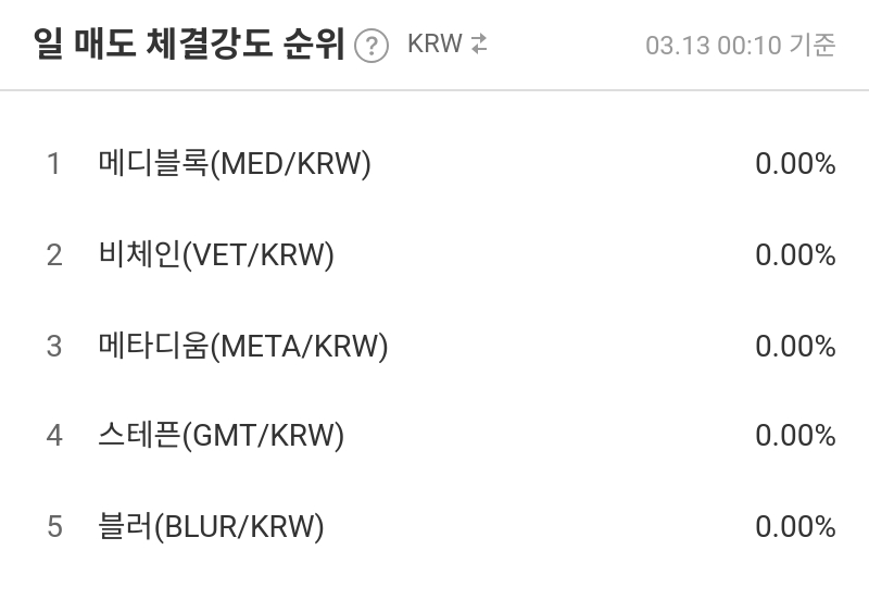 반면, 일 매도 체결강도 상위권은 MED, VET, META, GMT, BLUR가 모두 0.00%로 나타나며 매도 우위가 극단적으로 강화된 모습이다. 단기적으로는 매수세 이탈 또는 방어 실패 구간에서 이런 수치가 동반될 수 있어, 가격 변동 및 거래량 변화와 함께 점검하는 접근이 유효하다.