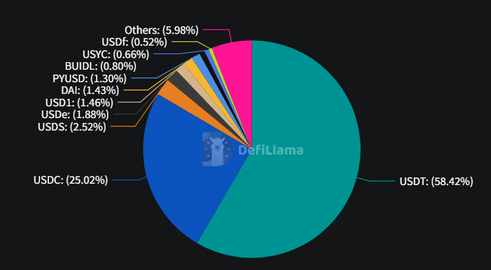 스테이블코인 시장 점유율을 보면 1위 테더(USDT)가 1839억3500만 달러(58.42%)로 가장 높은 비중을 차지하고 있으며 2위 USD코인(USDC)은 787억9700만 달러(25.02%)로 뒤를 이었다.