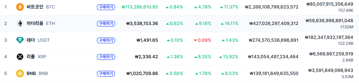 같은 시점 주요 암호화폐 흐름을 보면 비트코인은 약 1억1,300만 원, 이더리움은 350만 원대에서 거래되며 완만한 상승 흐름을 이어가는 모습이다. 다만 최근 단기 상승률에서는 XRP의 움직임이 상대적으로 두드러진다.