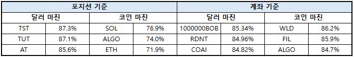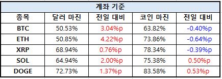계좌 기준에서는 전반적으로 롱 포지션 확대 흐름이 포착됐다. 비트코인(BTC)은 달러 마진 기준 롱 비율이 50.53%로 3.04%p 상승하며 매수 비중이 강화됐지만, 코인 마진 기준에서는 63.82%로 0.40%p 감소해 파생상품 구조별 온도차가 나타났다.