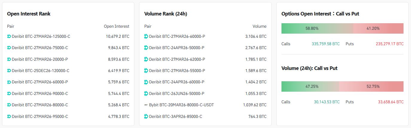24시간 거래량 기준 상위 계약은 ▲6만 달러 풋옵션(3월 27일·데리비트) ▲5만 달러 풋옵션(4월 24일·데리비트) ▲6만2000달러 풋옵션(3월 27일·데리비트) 순으로 나타났다.