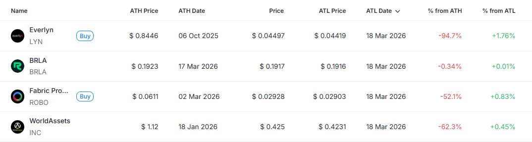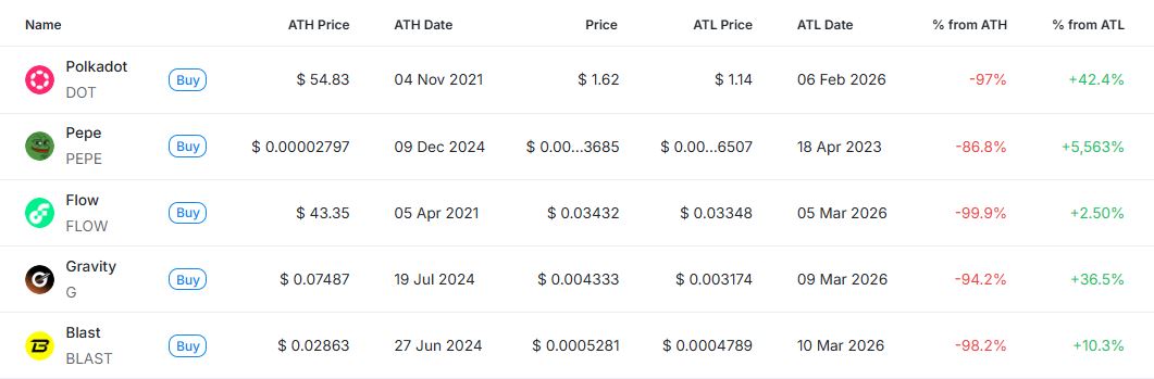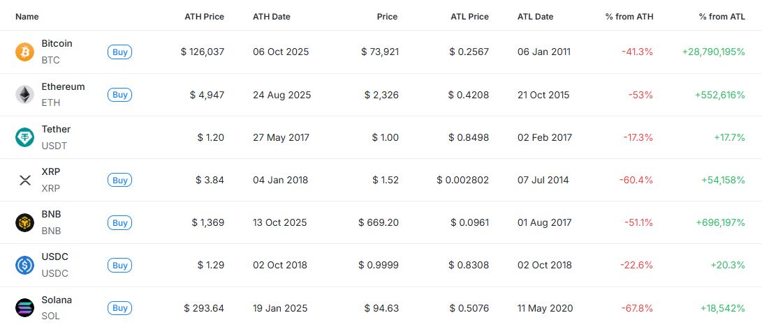 [편집자주] 암호화폐 시장은 하루 새 고점과 저점이 빠르게 바뀌는 고변동성 환경이다. 역대 최고가(ATH)와 역대 최저가(ATL) 경신 종목을 추적하면 강세와 약세 흐름을 조기에 포착할 수 있다. 크립토랭크 기준 시가총액 1000만 달러 이상 종목 중 하루 사이 고점 또는 저점을 경신한 주요 토큰을 정리하고 시가총액 상위 종목과 실시간 국내 인기 자산의 고점 대비 조정률을 함께 분석해 시장 회복 여력과 흐름을 진단한다.