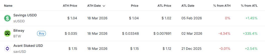 전체 3개 종목이 신고점 부근에서 거래됐다. 특히 sUSDD는 ATH와 동일한 가격을 기록하며 안정적인 흐름을 보였고, BTW는 최근 저점 대비 큰 폭 반등 이후 일부 조정을 받았다. savUSD 역시 ATH와 거의 동일한 수준에서 유지되며 스테이블 자산 특유의 안정성을 나타냈다.