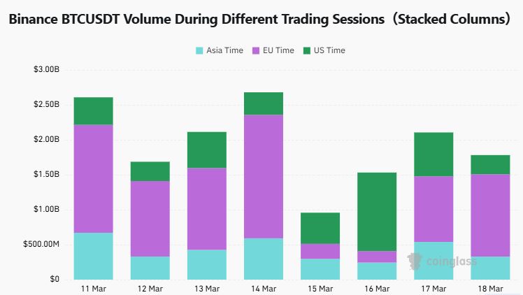 바이낸스 BTCUSDT 거래량은 아시아 시간대 3억2921만 달러, 유럽 시간대 11억8000만 달러, 미국 시간대 2억7427만 달러로 집계됐다.