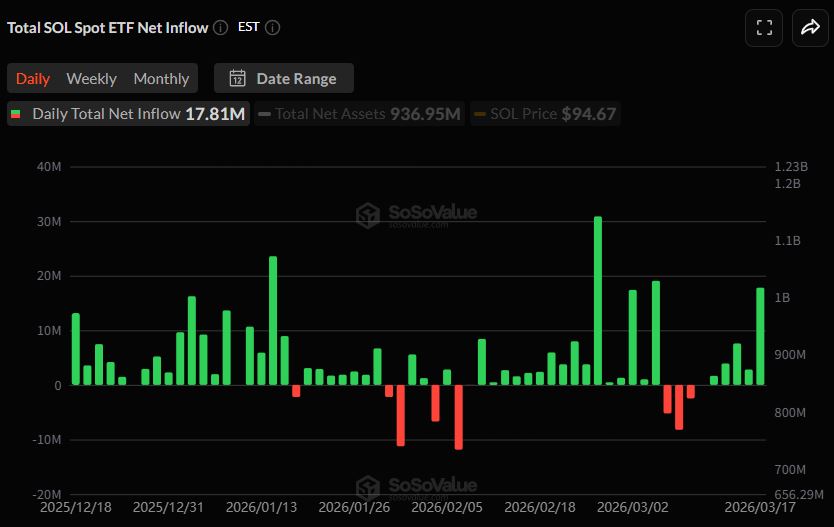 솔라나(SOL) 현물 ETF 시장은 1781만 달러의 일간 순유입을 기록했다. 지난 11일부터 5거래일 연속 유입세를 보였으며 이날은 전 거래일 대비 5배 이상 유입 규모가 증가했다.