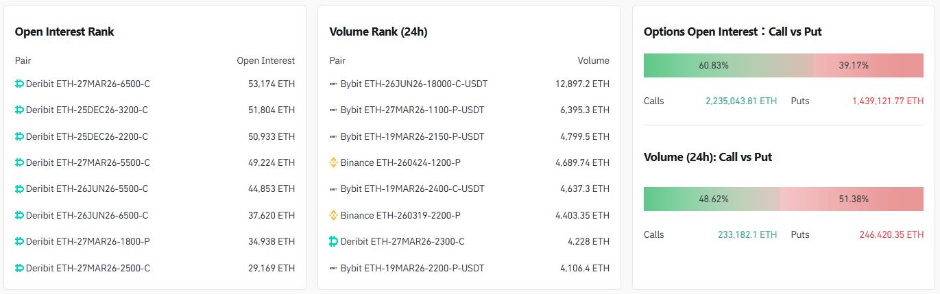 24시간 거래량 기준 상위 계약은 ▲1만8000달러 콜옵션(6월 26일·바이비트) ▲1100달러 풋옵션(3월 27일·바이비트) ▲2150달러 풋옵션(3월 19일·바이비트) 순으로 나타났다.