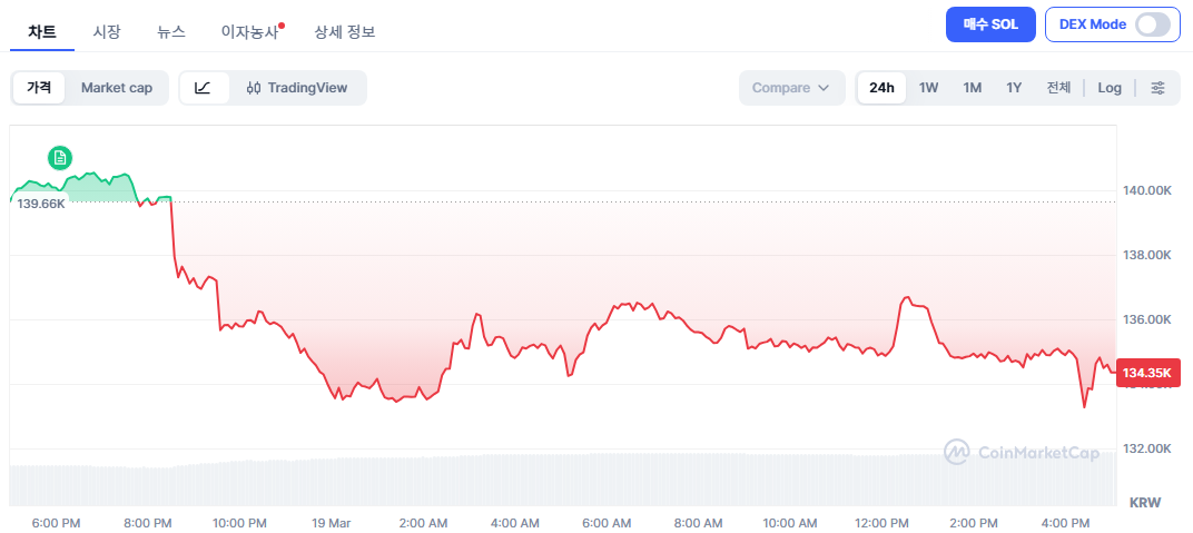 특히 반등 구간마다 고점이 낮아지고, 이후 재차 하락하는 패턴이 반복되면서 단기적으로는 매도 우위 흐름이 이어지는 모습이다. 현재 가격은 약 13만4000원 수준으로, 24시간 기준 약 4% 내외 하락세를 기록 중이다.