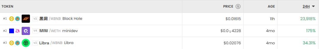 가장 크게 오른 거래쌍은 블랙홀(黑洞/WBNB)로 24시간 기준 2만3918% 상승했다. 이어 미니데브(MINI/WETH)는 175% 상승, 리브라(Libra/WBNB)는 34% 상승했다.